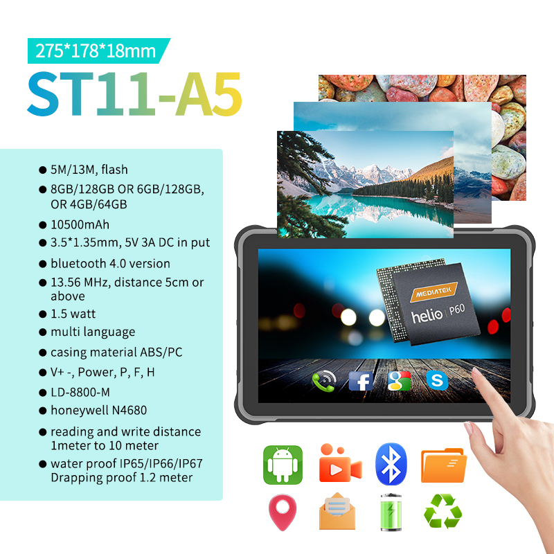 The ST11-A5 Rugged Tablet is a durable, high-performance device powered by Android 11, designed for challenging environments with a strong set of features. Key specifications include: